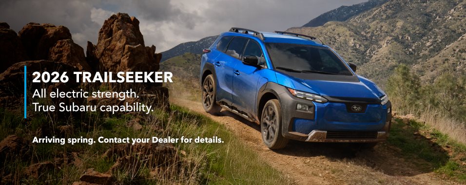 Introducing the all-new 2026 Subaru Trailseeker—Subaru capability and fully electric. Engineered for life in Canada, the Trailseeker pairs real-world electric performance with the ruggedness and versatility drivers expect from a true Subaru SUV. With an all-electric range of up to 444 km of range¹ in ideal conditions and DC fast charging from 10–80% in about 30 minutes², it is designed to keep everyday driving simple and weekend plans intact. Dual-motor all-electric Symmetrical Full-Time AWD works seamlessly with dual-function X-MODE® to deliver confident, predictable traction in rain, snow and loose conditions. A generous 1,587 kg towing capacity, 215 mm of ground clearance and a spacious, flexible cargo area give the Trailseeker the kind of utility rarely seen in an EV. Inside, a quiet, well-appointed cabin blends modern technology with everyday comfort. Electric power, engineered for real use. Rugged versatility, without compromise: unmistakably Subaru.